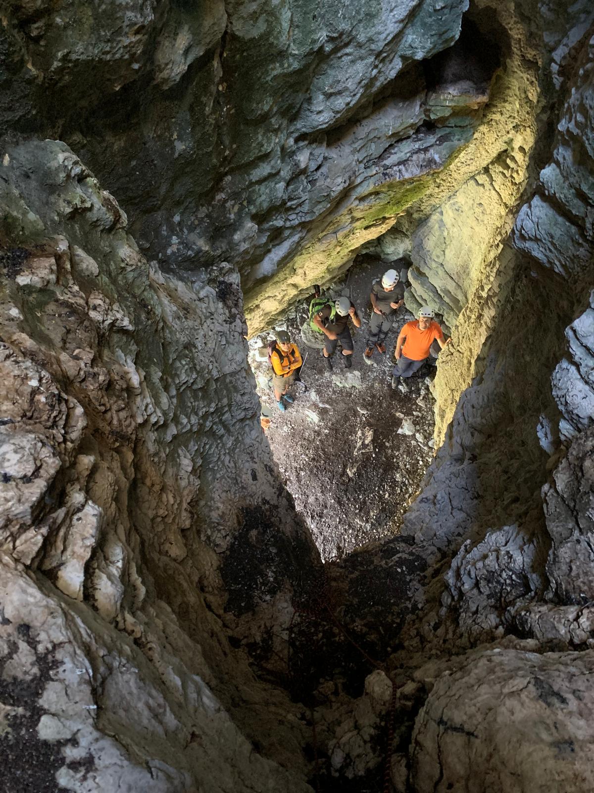 Zufrieden und wohlgenährt geht's wieder zurück, wo in 2 Malen abgeseilt wird... Die 2. Abseilstelle ist eine bekannte und interessante Abseilstelle, welche durch einen Tunnel führt... war wirklich cool... der Aussteig aus einem "Höhlenmund", dann wieder ein Abstieg durch felsiges, dann grasbewachsenes Steilgelände... Sicher kommen wir wieder auf den Höhenweg, wo die Helme wieder versorgt werden können. Wir waren sehr effizient beim Abseilen und somit konnte der anfängliche Zeitverlust locker wieder aufgeholt werden...