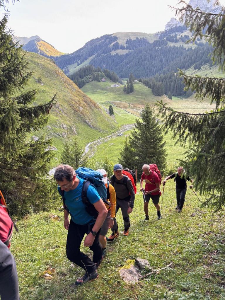 Wetter einfach perfekt, Sonnenschein, wolkenlos, angenehme Temperaturen... zu neunt gehts los (mit 3 Minuten Verspätung ;-) ), wir laufen zuerst auf dem Gros-Mont-Plateau bis kurz vor der Alphütte Le Sori, zweigen in Richtung Morteys ab und nehmen dann rasch den steilen Aufstieg in Richtung Hütte Joux à Marro. Pascal kennt den Weg perfekt und führt uns einwandfrei durch den Wald, die schönen Kuhweiden zum oberen Ringweg (ca. 1740 m).