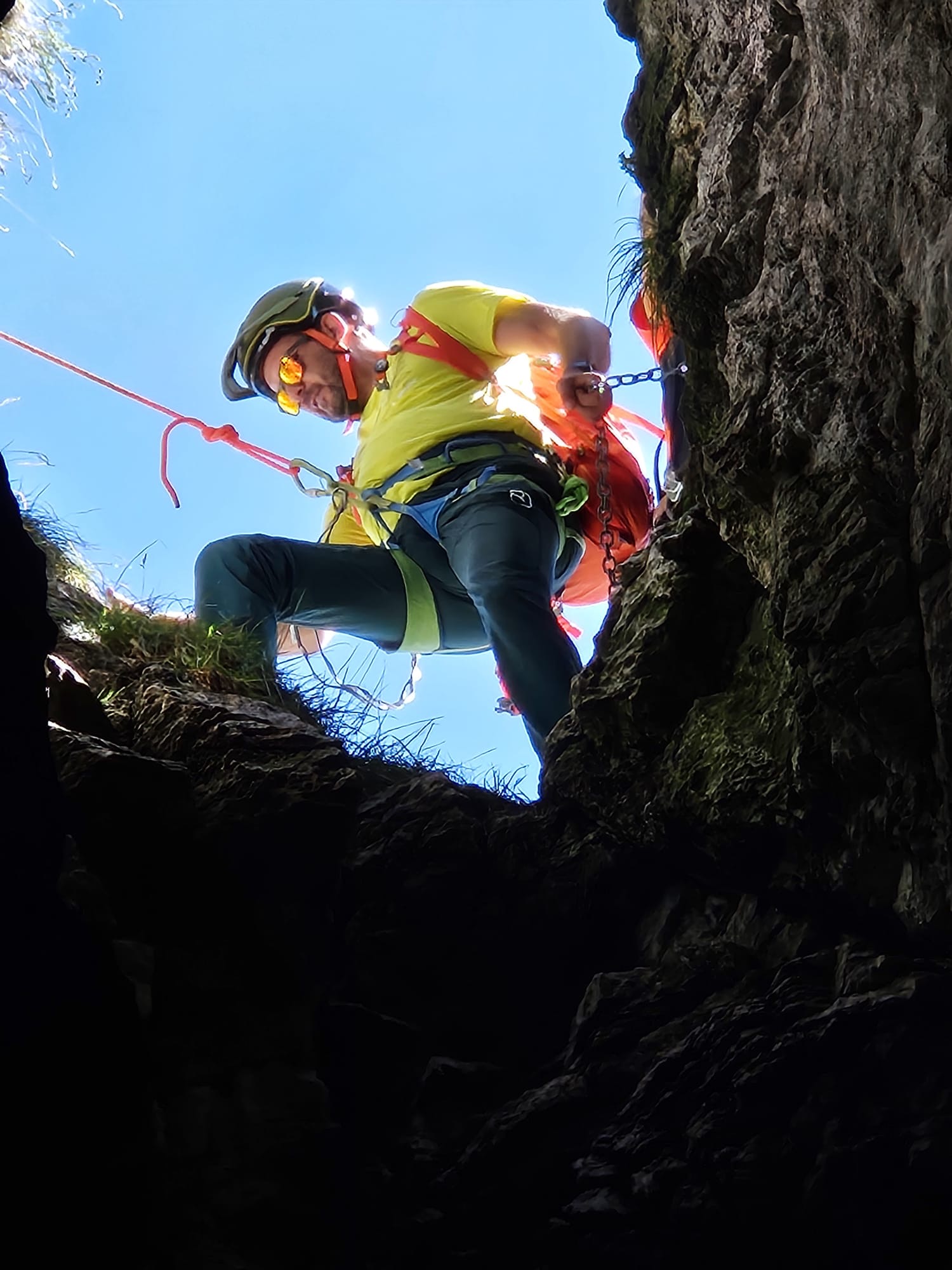 Kurz vor dem Ziel wird ein erstes Mal abgeseilt, ca 20 m, dann muss über eine 1.50 m breite Felsspalte gesprungen und wieder ca 30 m hochgeklettert werden...