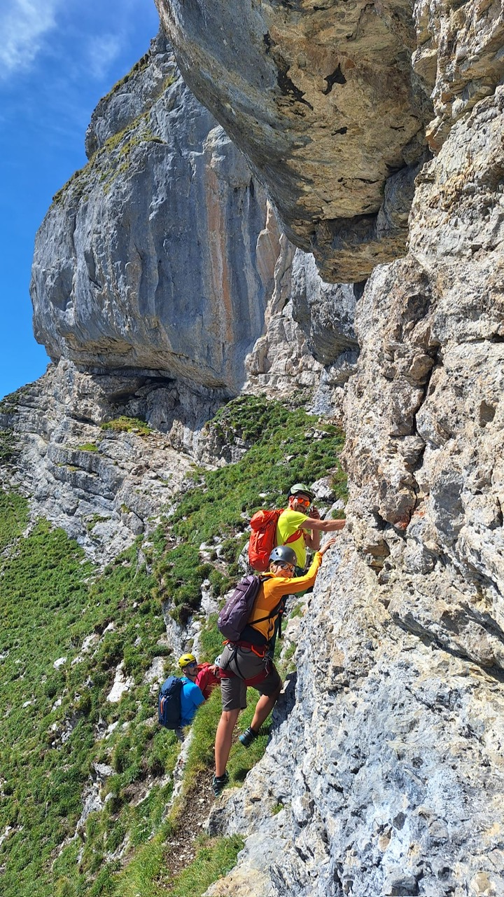 Der massive Felsklotz des Dent des Bimis ragt vor uns auf... eindrücklich, fast wie eine unbezwingbare Burg... Wir folgen einige Kilometer dem Höhenweg und kurz vor der Tour de Doréna steigen wir im Steilgras (Lieblings-Gelände von Pascal) hoch zu einer Verschneidung, welche wir kletternd ohne Mühe überwinden... Eine wunderschöne Sicht auf die beiden mächtigen Felsformationen des Dent de Folliéran und Dent de Brenleire offenbart uns... Wow, einfach nur imposant.