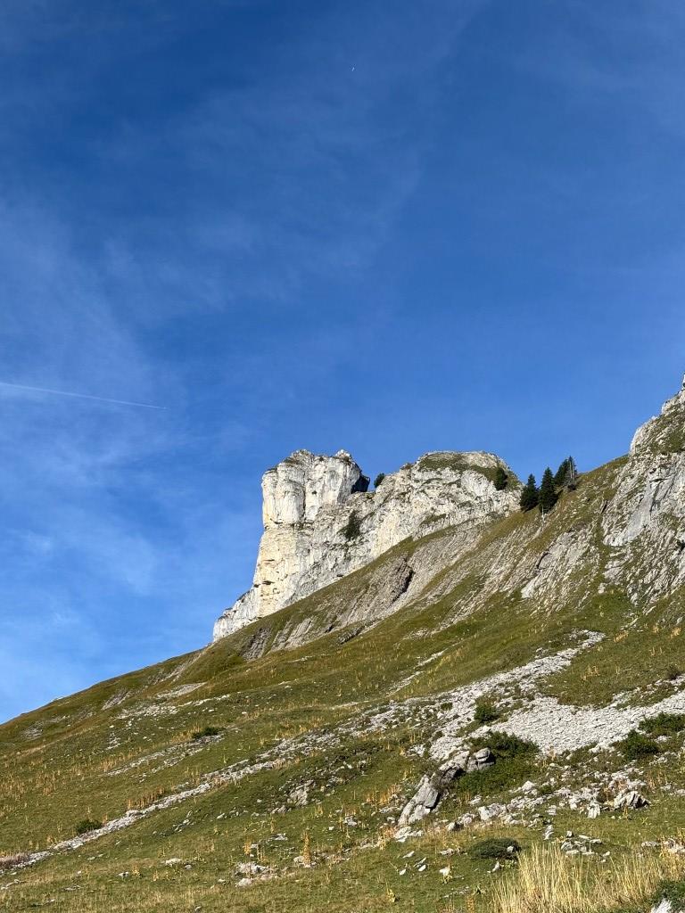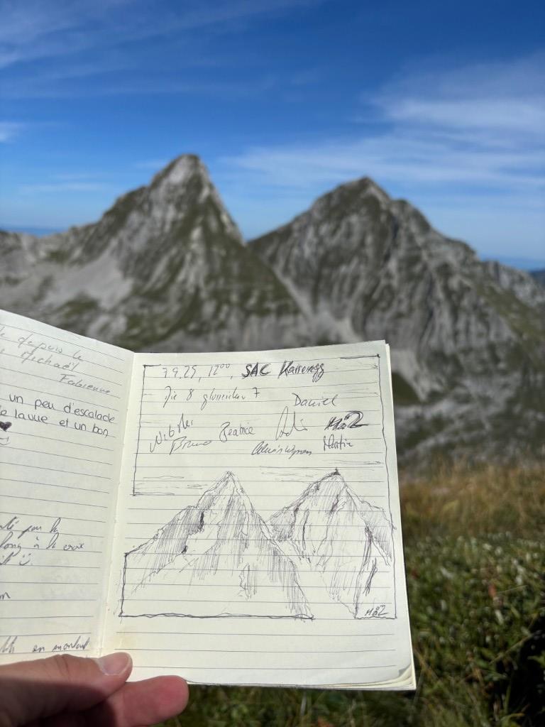 Der massive Felsklotz des Dent des Bimis ragt vor uns auf... eindrücklich, fast wie eine unbezwingbare Burg... Wir folgen einige Kilometer dem Höhenweg und kurz vor der Tour de Doréna steigen wir im Steilgras (Lieblings-Gelände von Pascal) hoch zu einer Verschneidung, welche wir kletternd ohne Mühe überwinden... Eine wunderschöne Sicht auf die beiden mächtigen Felsformationen des Dent de Folliéran und Dent de Brenleire offenbart uns... Wow, einfach nur imposant.