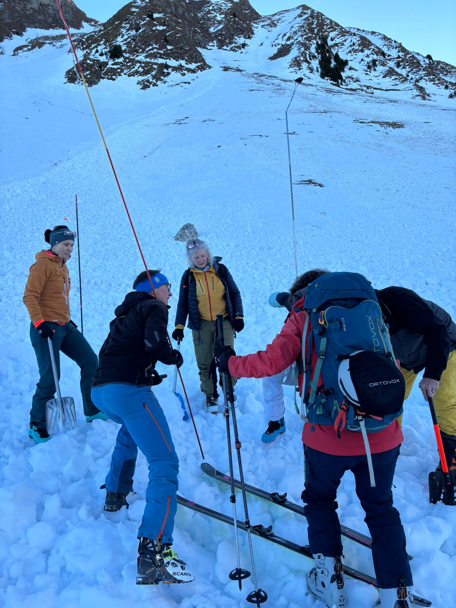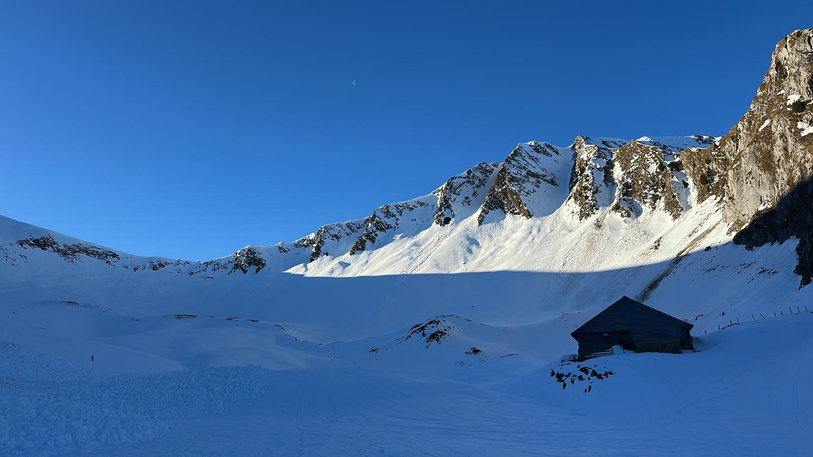 Wir starteten bei der Unteren Gantrischhütte in Richtung Morgetepass. Die Temperatur: kalt, mehrere Grad Celsius unter dem Gefrierpunkt. Bei der Chummlihütte reichten die Nassschnee-Niedergänge bis auf den Talboden von Gantrischchummli. Wir nutzten die beachtlichen Schneemengen für eine erste Theorielektion und eine Suchübung mit Lawinenverschüttetensuchgerät LVS, Sonde und Schaufel.