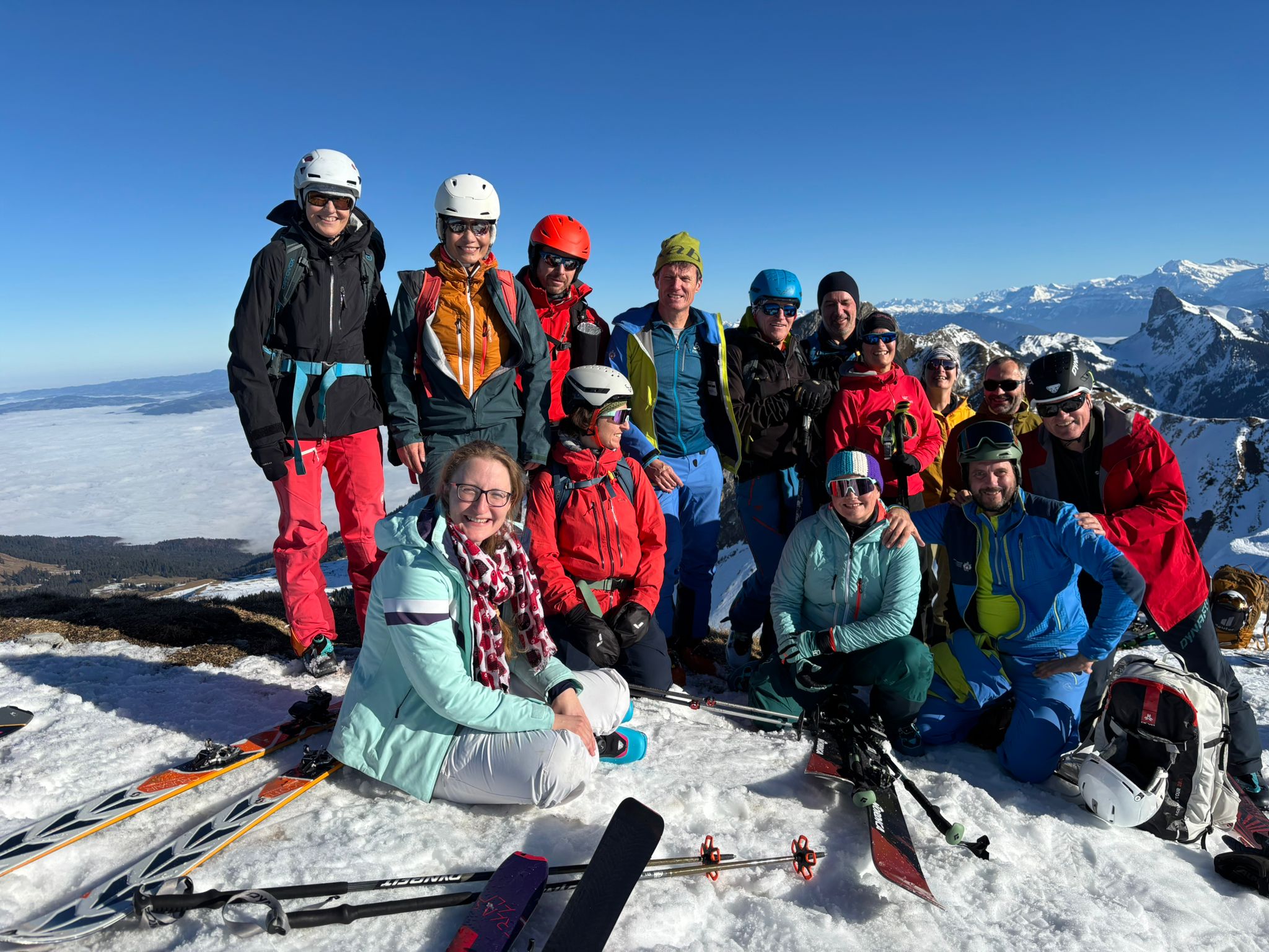 Etwas Sulz auf einer harten Schneedecke: Die Abfahrt über die Südflanke des Bürgle zurück zum Morgetegrat – und für die Fitten bis zur Obriste Morgete – war ein Genuss. Nach einem weiteren kurzen Aufstieg fuhren jene, die es etwas weniger steil mögen, vom Morgetegrat zurück ins Gantrischchummli. Wer es gerne etwas steiler hat, stieg bis auf den Schibespitz. Die Abfahrt von da aus: steil, hart aber griffig.